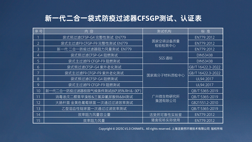 并且通过复合滤料,形成G4+F9梯度过滤,新一代二合一袋式防疫过滤器当然新产品的好处远不止于此,这是基于它已经通过了的测试和验证得出的结论。它已经接受了来自国家空调设备质量检验检测中心;SGS、国家高分子材料质检中心。广州微生物研究所等权威机构的各种测试。这是做过的各类测试、认证汇总: