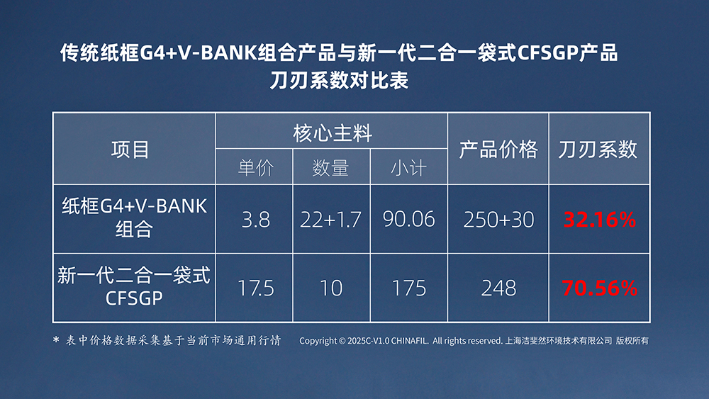 实现升级跨越,是贯穿产品设计始终的"刀刃系数"优化理念。该指标量化了核心功能材料成本占总成本的比例,揭示了传统过滤器的结构性缺陷:在板式初效中,仅绿色滤布具备过滤功能,辅材占比超67%;V型过滤器中白色玻纤滤纸的核心成本占比仅32.16%。新一代产品通过结构创新,将刀刃系数提升至70.56%,使每元投入的过滤效能倍增。这种设计哲学的本质,是对"买椟还珠"式资源错配的颠覆——通过精简辅材消耗与优化制造工艺,将70%以上的成本精准投向核心滤材。