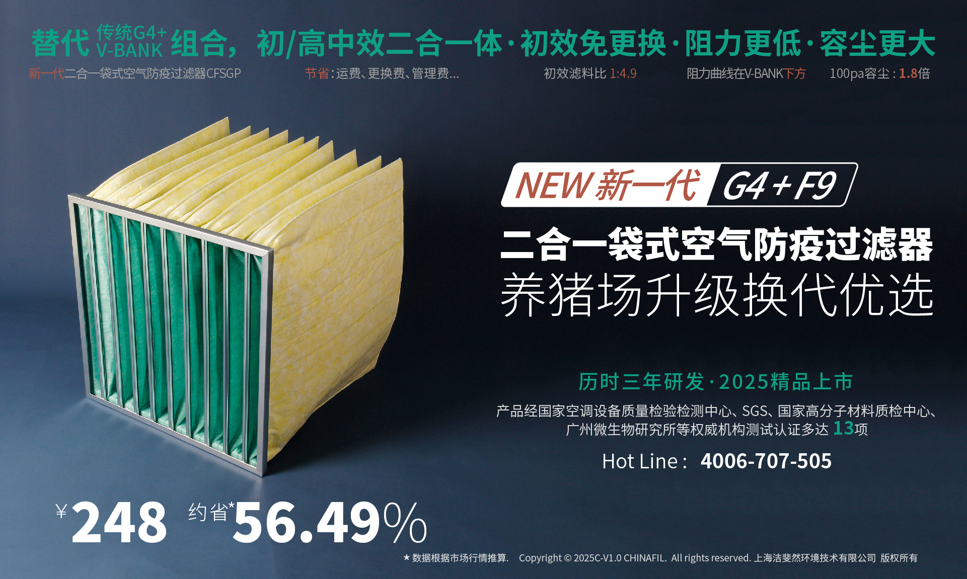新一代二合一袋式猪场防疫过滤器CFSGP,是G4纸框板式+F9-V-bank过滤器模块的升级产品。它初效部分的滤料面积是传统G4纸框的4.9倍容尘量更大,因此免除了畜牧防疫中繁杂的初效更换环节,仅此一项,减少的不仅仅是更换成本,也避免了更换时感染的风险。它的主过滤部分同样是F9效率,作为袋式过滤器,实现了批量规模化F9效率,这是难得的行业突破;