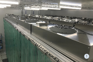在生产环节中,对局部区域空间环境洁净度有更高需求的工序制程可采用洁净棚,净棚也称为微环境洁净棚、洁净区,实质上是一种在无尘洁净车间实现可控的局部更高洁净等级空气净化设备。主要由FFU风机过滤单元(含:工业风机空气过滤器、箱体、控制元件、净化灯)、棚体框架结构(钢架、铝型材)、防静电PVC垂帘软片等组成。其中,FFU根据风量和洁净度的不同需求可阵列也可单列。