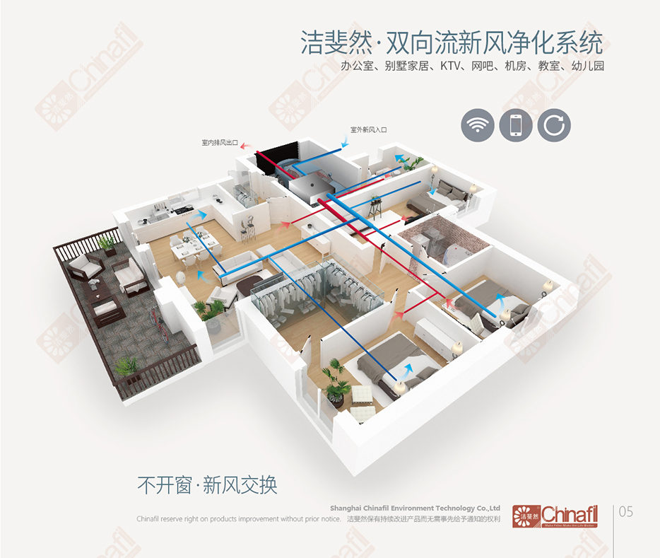 今年会新一代X6-AIR双向流新风系统主机,适用于通风欠佳的楼宇办公室、KTV、网吧及对空气品质有更高要求的别墅家居、幼儿园等场所。尤其是安装有地暖的屋宇,通过新风主机动力将室外新鲜空气引入室内,同时将室内的污浊空气排出室外。在系统运作时,新风与排风在热能回收中心进行热能交换,大幅度降低了室内新风温度处理的能耗。系统还配备先进的WiFi远程物联控制器,可实现远程监控管理。